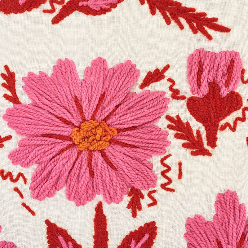 Happy and humble, Marguerite Embroidery features a hand-stitched floral design on a linen ground. Subtle irregularities in the wool yarns create dimension and quaint charm.