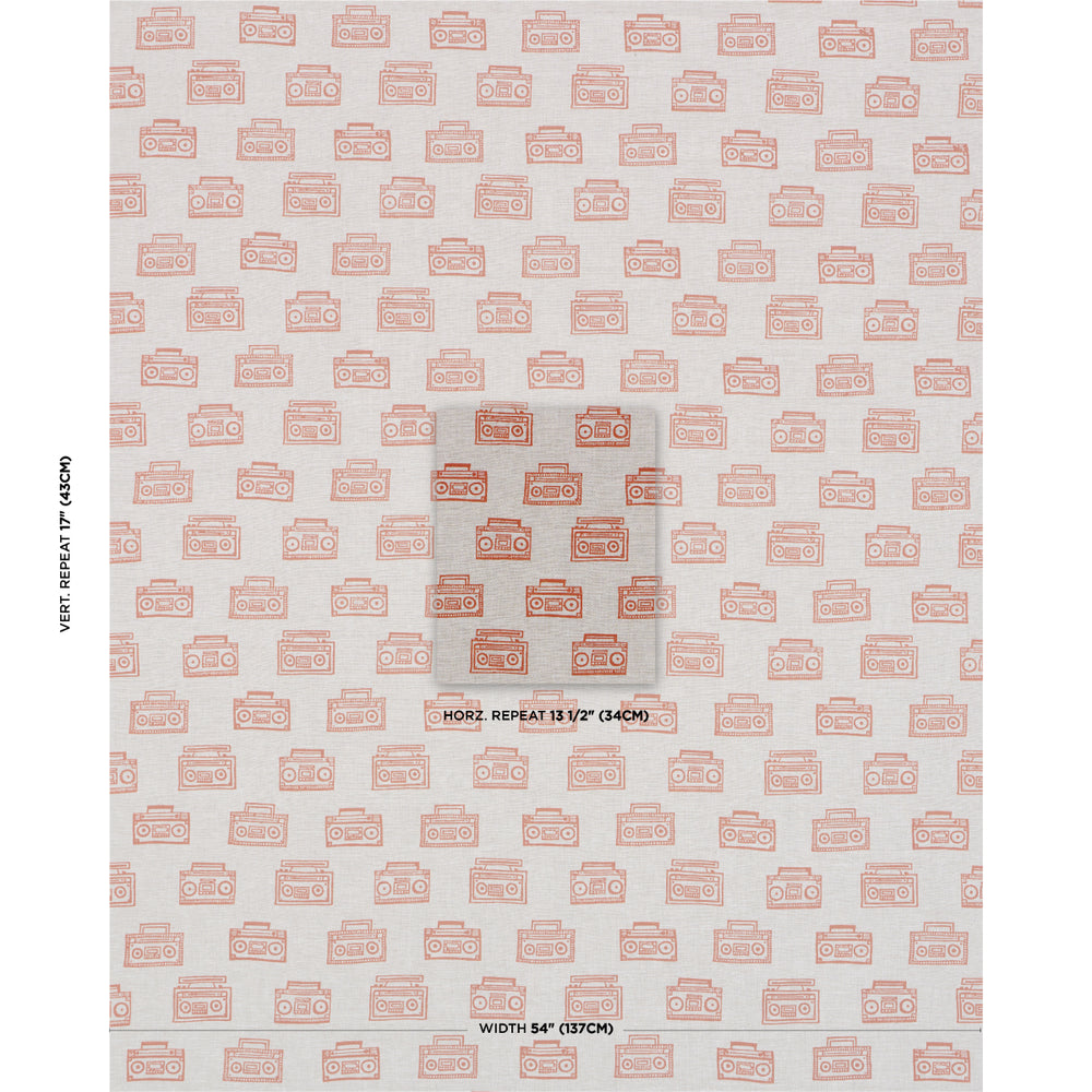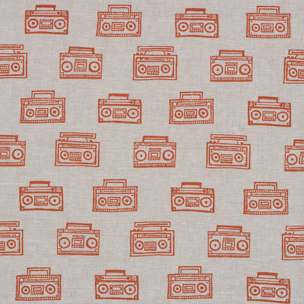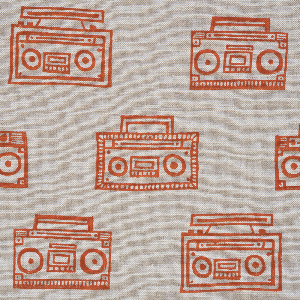 Created in collaboration with Hadiya Williams, Ode Hand Block is an artful homage to a 1980s icon. This funky, graphic boombox pattern is printed by hand to accentuate the unique character of Williams’s original sketches. Suitable for upholstery, window treatments, or pillows, this modern medium-scale fabric adds a blast of style to any room. -