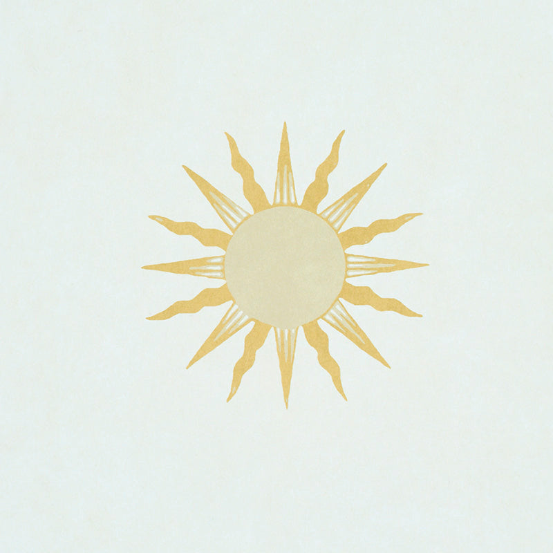 A stylized trellis wallcovering with a sun motif and a large scale features a mottled texture and muted tones so it almost looks like painted stone. -