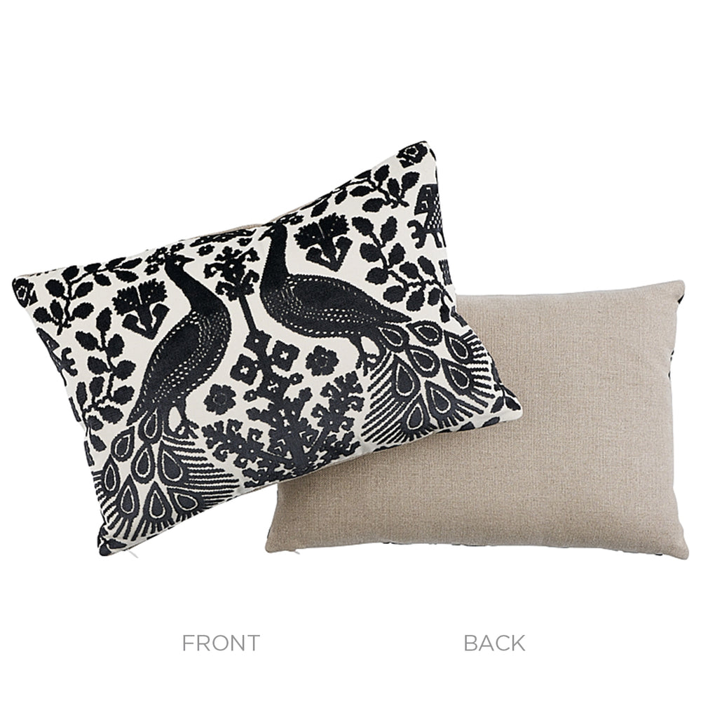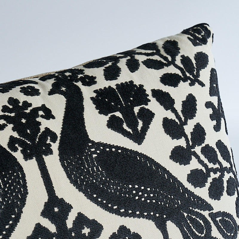 This pillow features Pavone Velvet with a knife edge finish. A host of sources, from Peruvian weavings to Ukranian embroidery, inspired this design. Its imaginative combination of peacocks and flowers with a mirrored repeat have an enchanting, antique look. Back of pillow features Piet Performance Linen. Pillow includes a feather/down fill insert and hidden zipper closure. -