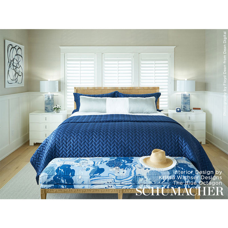 Originally produced by Schumacher in 1918, the captivating pattern was ahead of its time, and still feels startlingly sophisticated and fresh today. Also available as a wallcovering. -