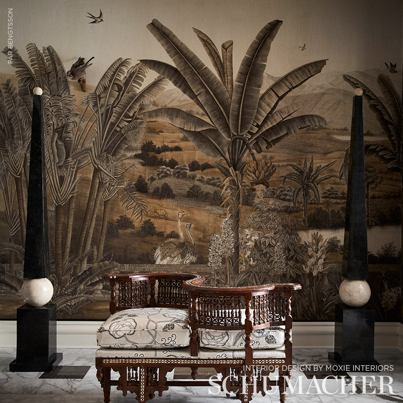 Neisha Crosland looked to far-ranging influences—luscious tropical mangosteens, the elaborate gold-outlined flora on a 16th-century English needlework bed hanging—for this opulent botanical chintz, with its stylized blossoms and curlicued leaves climbing upward like a luxuriant tree of life. Also a wallcovering.