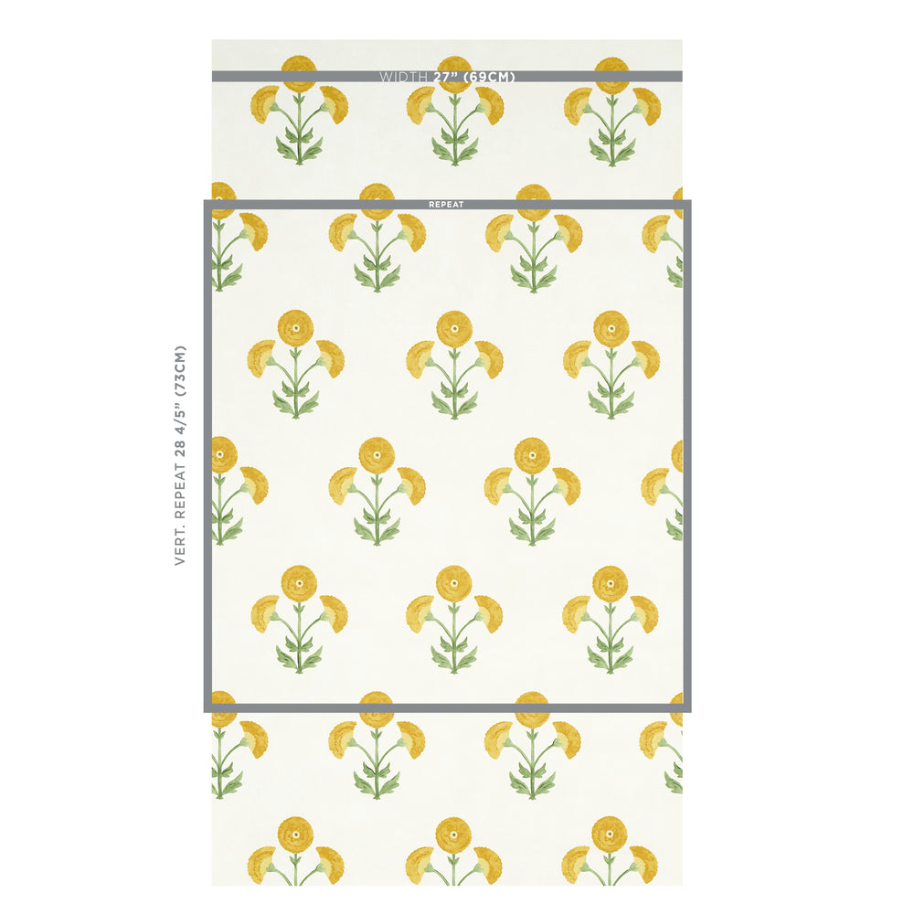 Inspired by traditional Indian hand-block designs, marigold-colored Saranda Flower wallpaper features stylized flowers printed on fibrous wallpaper for a painterly bouquet full of color and depth. Also available as a fabric and a textured wallpaper.