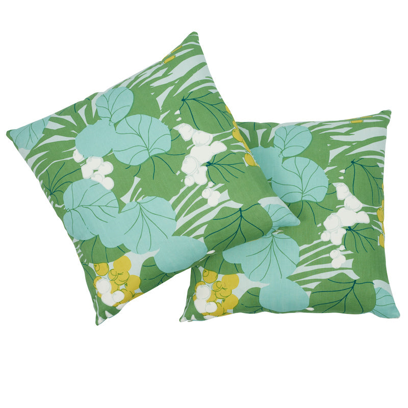 This pillow features Sea Grapes with a Knife Edge finish. A charming, painterly design of sea grapes and palms takes center stage in a screen print made using hand-mixed inks. Pillow includes a feather/down fill insert and hidden zipper closure.