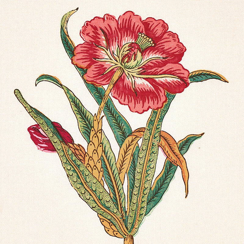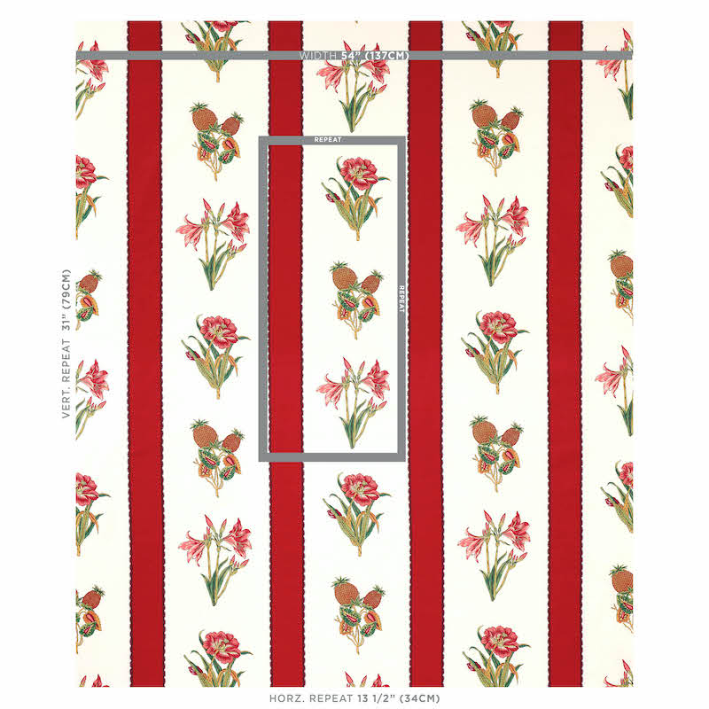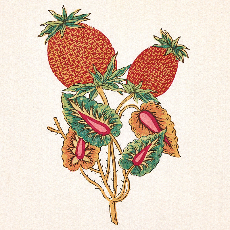 Based on a tiny fragment from the archives, this intermittent stripe features exotic botanicals interspersed with color. The illustrations—including rare, exquisitely rendered pineapples—are drawn with a decidedly European sensibility and a level of detai -