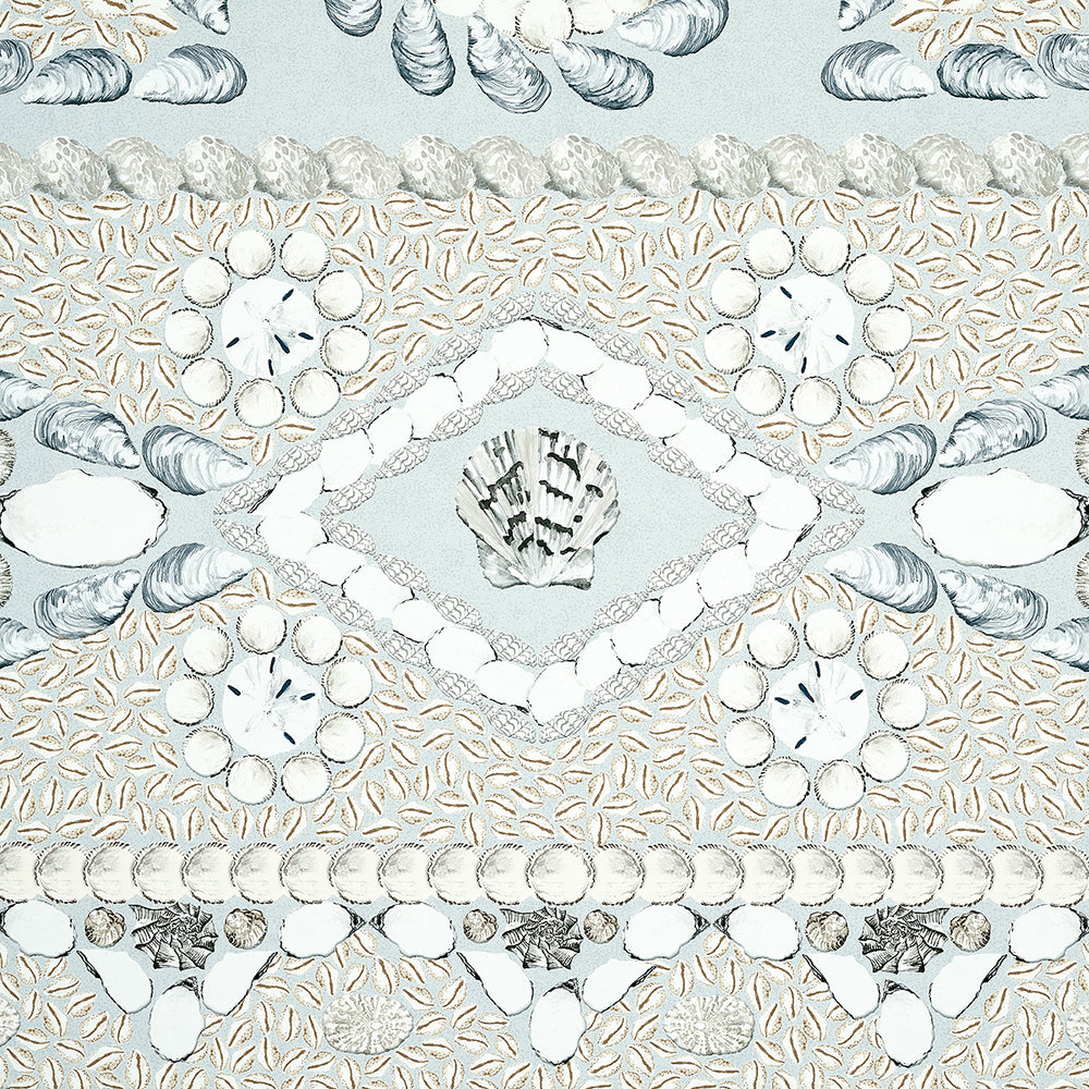 Mary McDonald was inspired by 17th- and 18th-century garden follies when she imagined seafoam-colored Shell Grotto Panel A, part of an extraordinary two-panel wallpaper set with a unique hand-painted aesthetic. Featuring classical architectural forms represented in beautifully detailed seashells, this panel can be cut and configured in countless ways to create a playful, intriguing and thoroughly memorable space. -