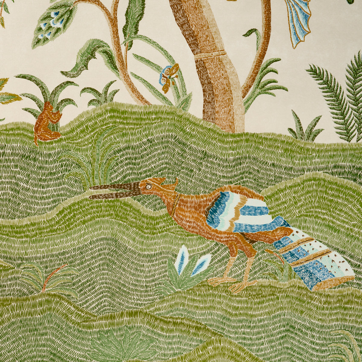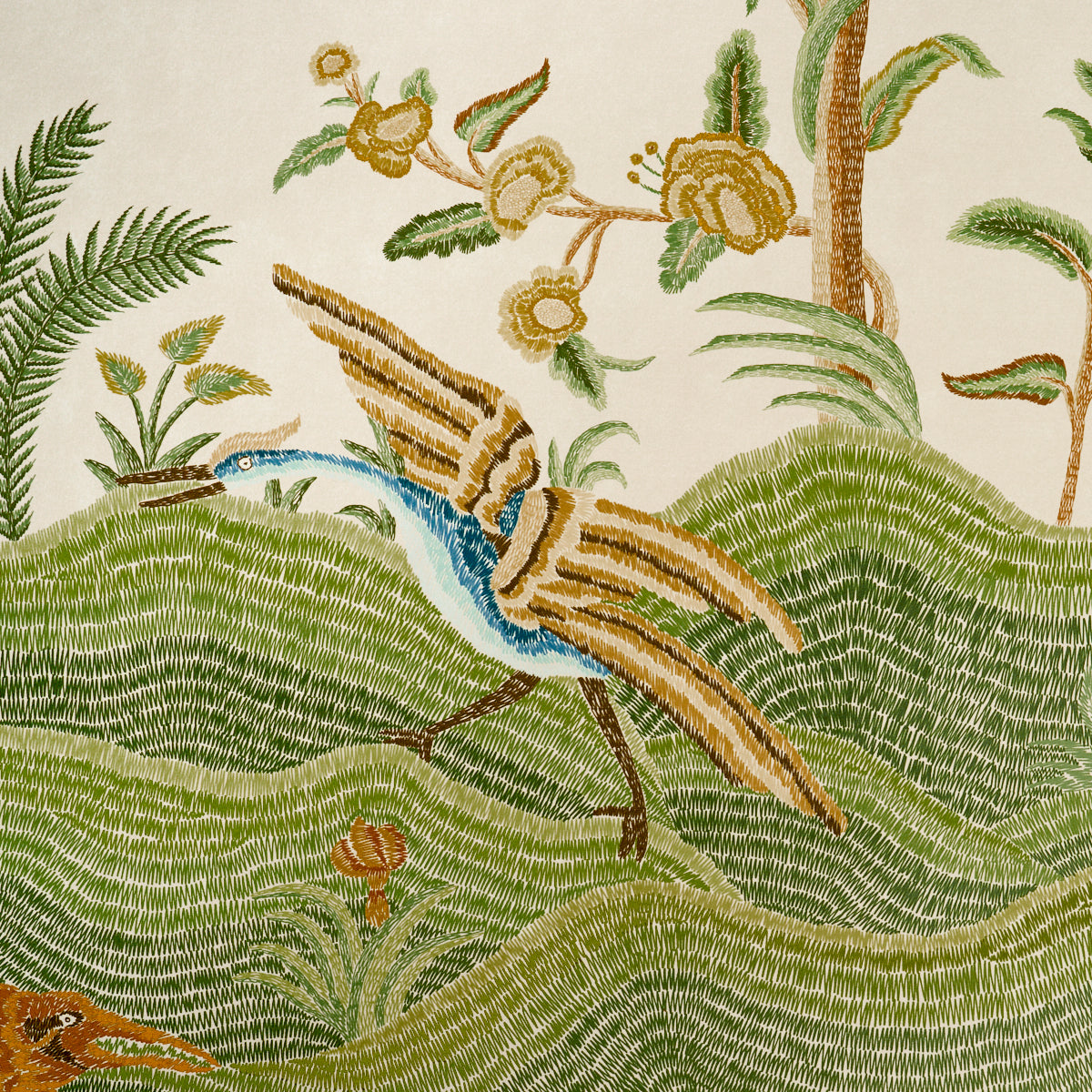 Inspired by a marvelous 18th-century crewelwork panel in the Colonial Williamsburg Foundation archive and featuring a scene hand-painted in our studio, Spotswood Crewel Panel Set is a colorful large-scale design with the three-dimensional look of an embroidered textile. Populated with a whimsical array of fanciful birds, monkeys, flowers, and foliage, this two-panel wallpaper creates a uniquely lively and exotic atmosphere. -