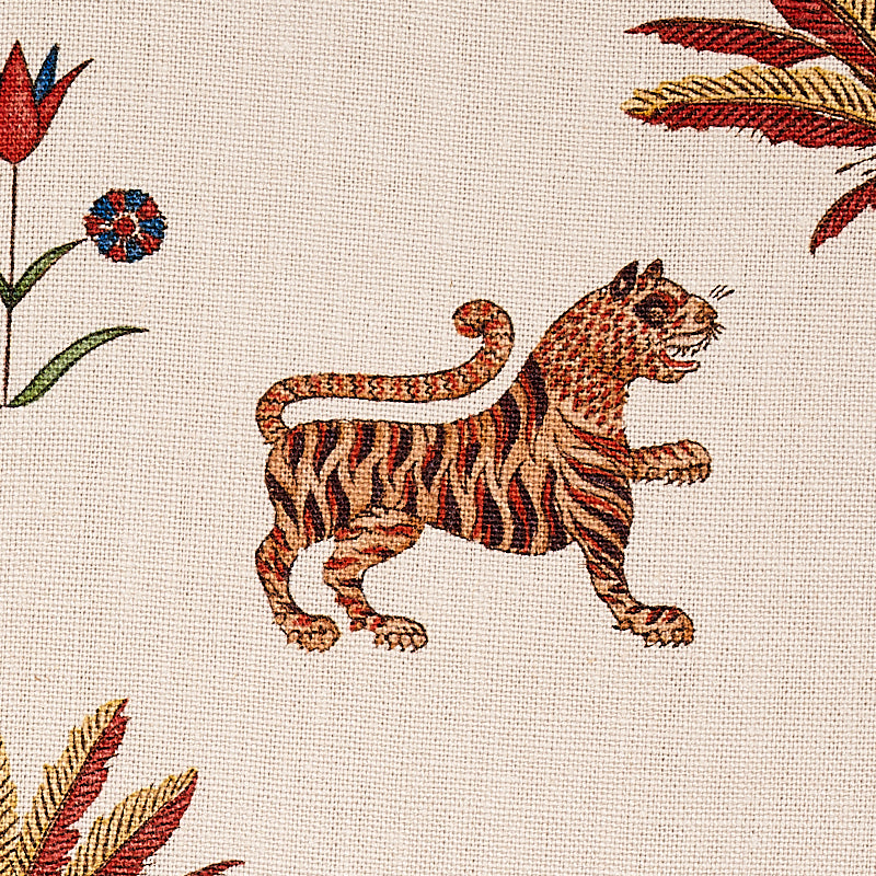 Part of the Mystique collection, Tiger Palm in crimson is an open, organized pattern printed on a soft linen ground. Inspired by antique block prints, this versatile, mid-scale fabric design features stylized palm trees, rampant tigers, and Ottoman flowers. Also available as a wallcovering.