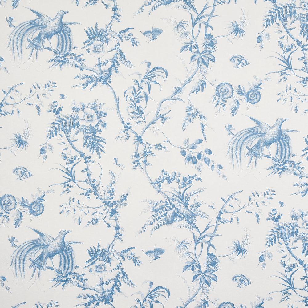A meadow’s worth of songbirds, butterflies, blooming branches, and seed pods intermingle on this bucolic pattern, recast from a circa-1820 toile. Also a fabric. -
