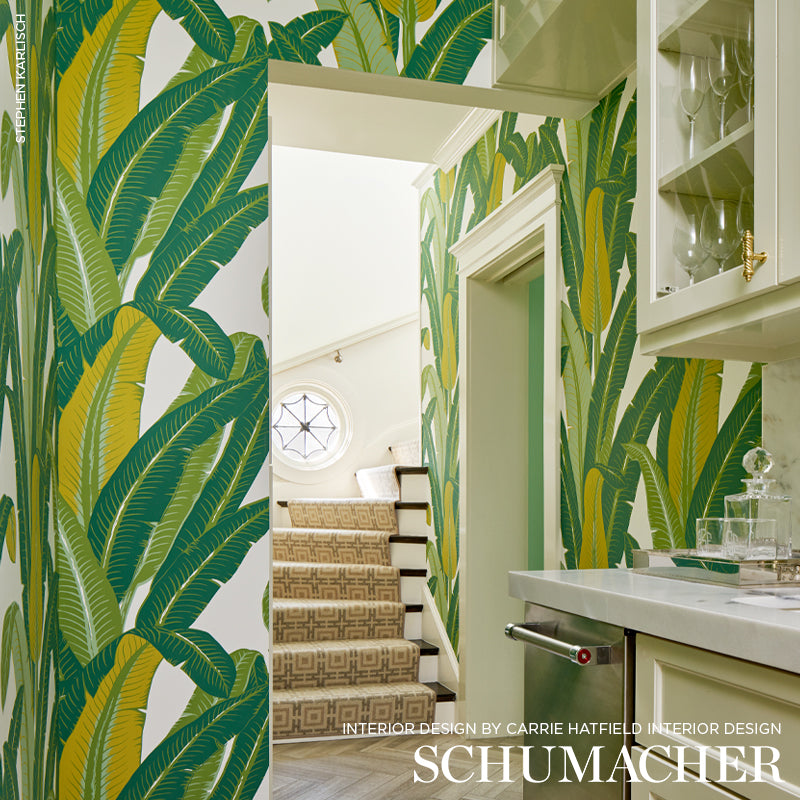 Palm Beach meets Hollywood Regency in this palm leaf pattern. With its scale, bright colors and vintage glamour, this lively wallpaper can turn any room into a tropical paradise. -