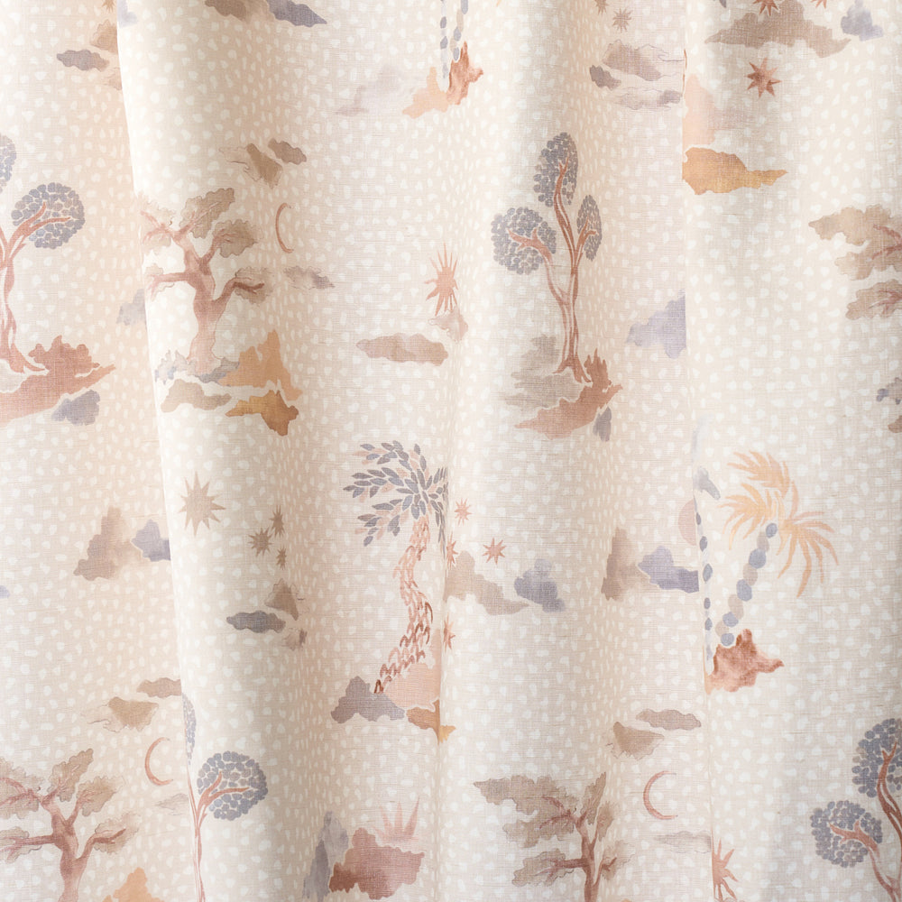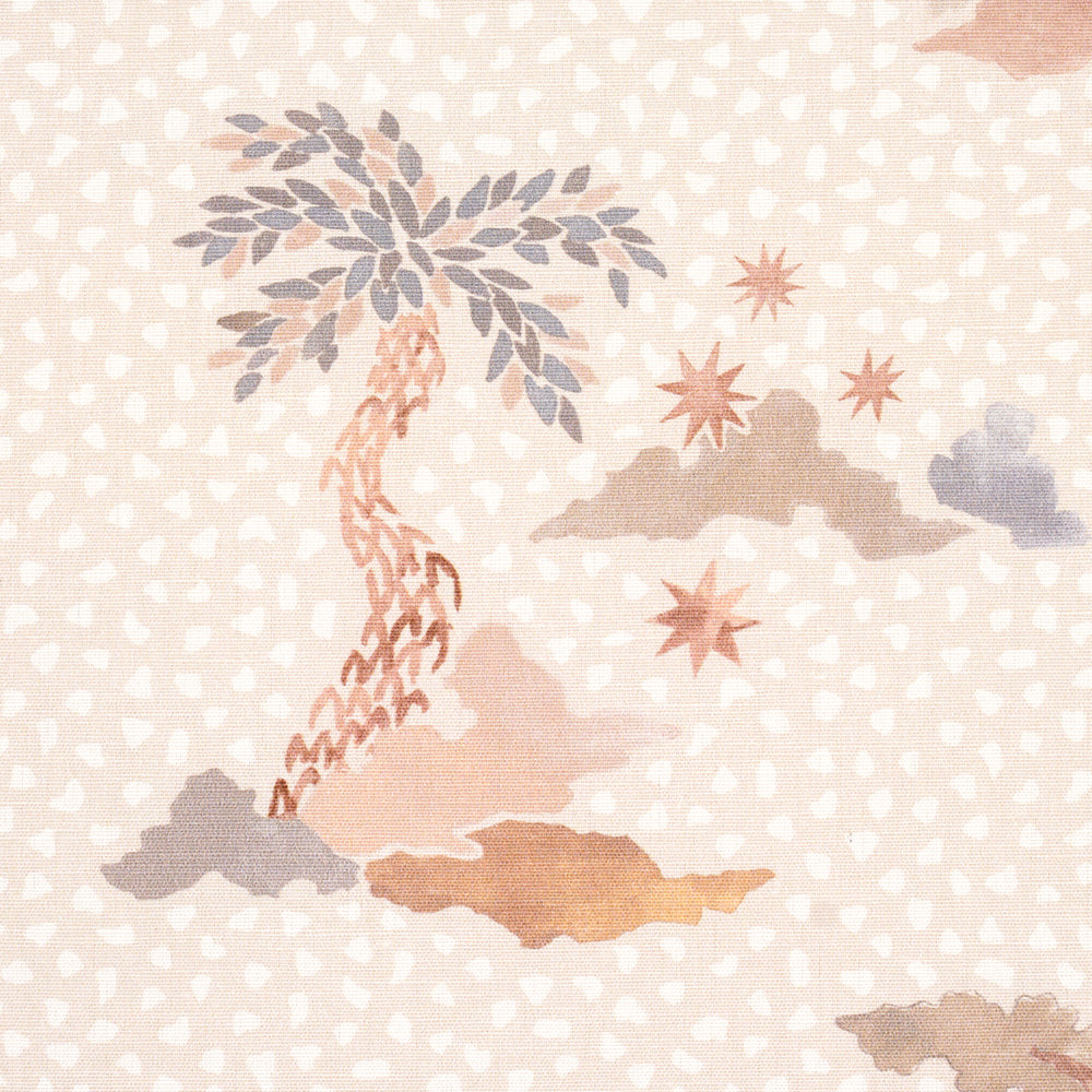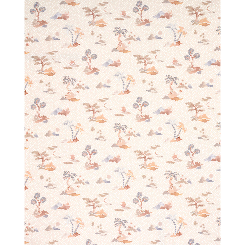 Inspired by the ancient capital of Malta, Valletta in sky-and-pink evokes the romance of a distant land with its exotic trees and celestial bodies floating on a stippled oceanic background. This enchanting fabric, designed by Happy Menocal, features wonderful tonal variations and a unique hand-painted aesthetic. Also available as a wallpaper. -