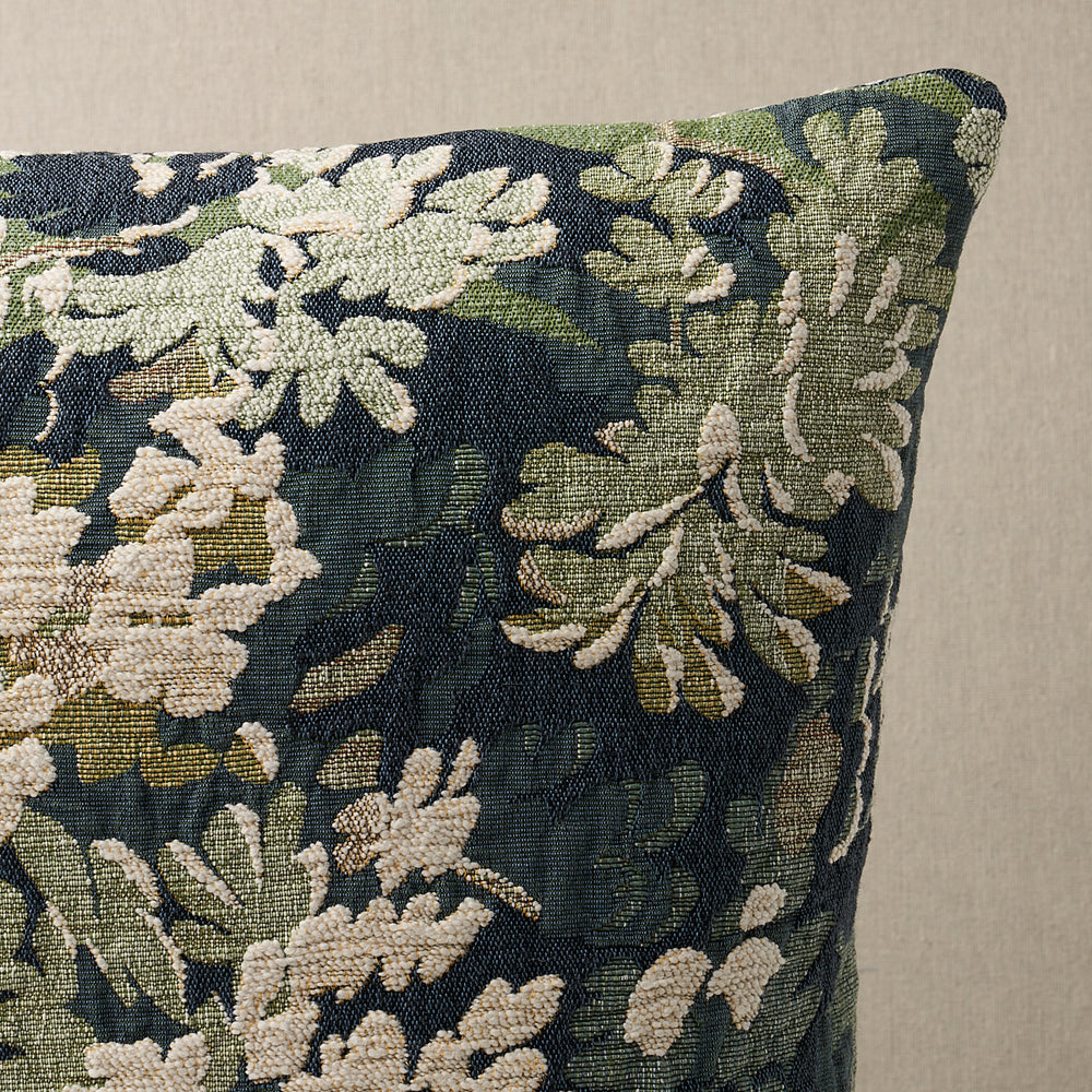 This pillow features Verdure Tapestry with a knife edge finish. Inspired by an antique French screen and based on artwork that was hand-drawn in our studio, Verdure Tapestry in peacock is a lush mid-scale foliage design that is rooted in tradition but relevant today. A luxurious tapestry weave with lovely tonal variations and a stonewashed finish, this fabric has magnificent dimension and a wonderfully soft hand. Pillow includes a feather/down fill insert and hidden zipper closure. -