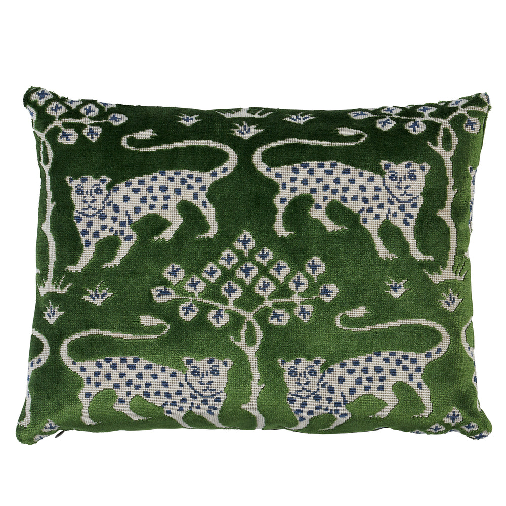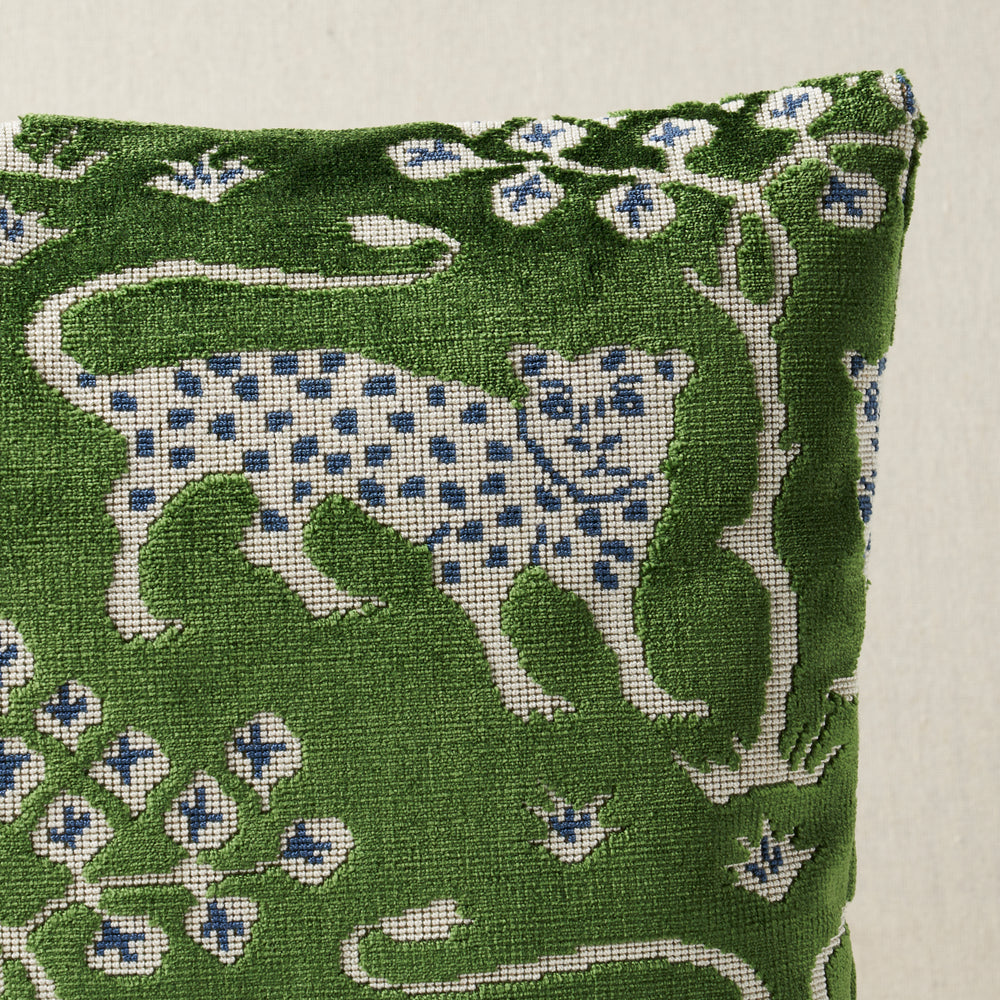 This pillow features Woodland Leopard Velvet with a knife edge finish. A host of historic paintings and textiles served as source material for this fabulously stylized leopard and tree motif. The midscale mirrored repeat design combines loop-and-cut pile sections that make the trees and big cats stand out in even sharper relief against the background. Pillow includes a feather/down fill insert and hidden zipper closure.