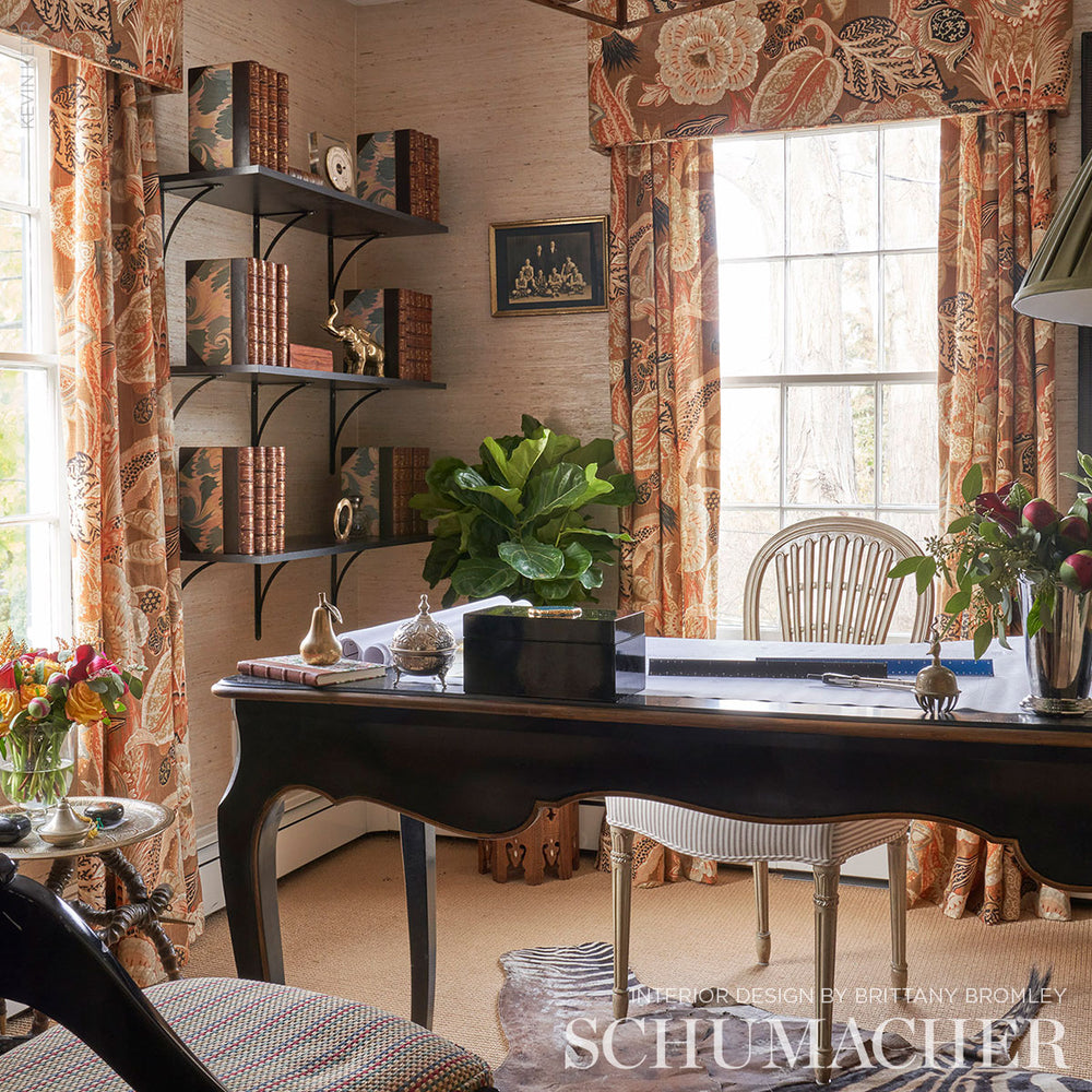 A swirling pattern-within-pattern design of exotic flowers and stylized leaves inspired by an Art Deco print.