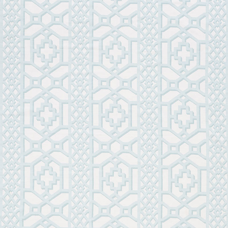 Inspired by Elsie de Wolfe's trellised rooms, this fretwork pattern was introduced in the 1970s. Reimagined with modern, graphic appeal, it's available as a fabric and a wallpaper. -