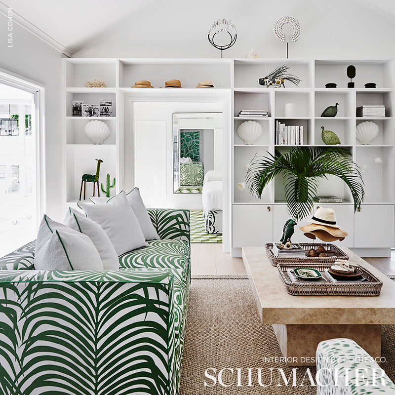 A striking hybrid that recalls both zebra stripes and tropical palm leaves, this pattern is wild and wonderful. Also available as a wallcovering and indoor/outdoor fabric.